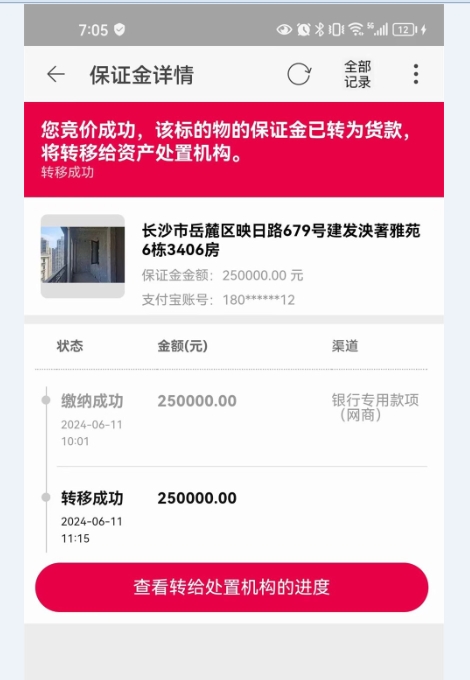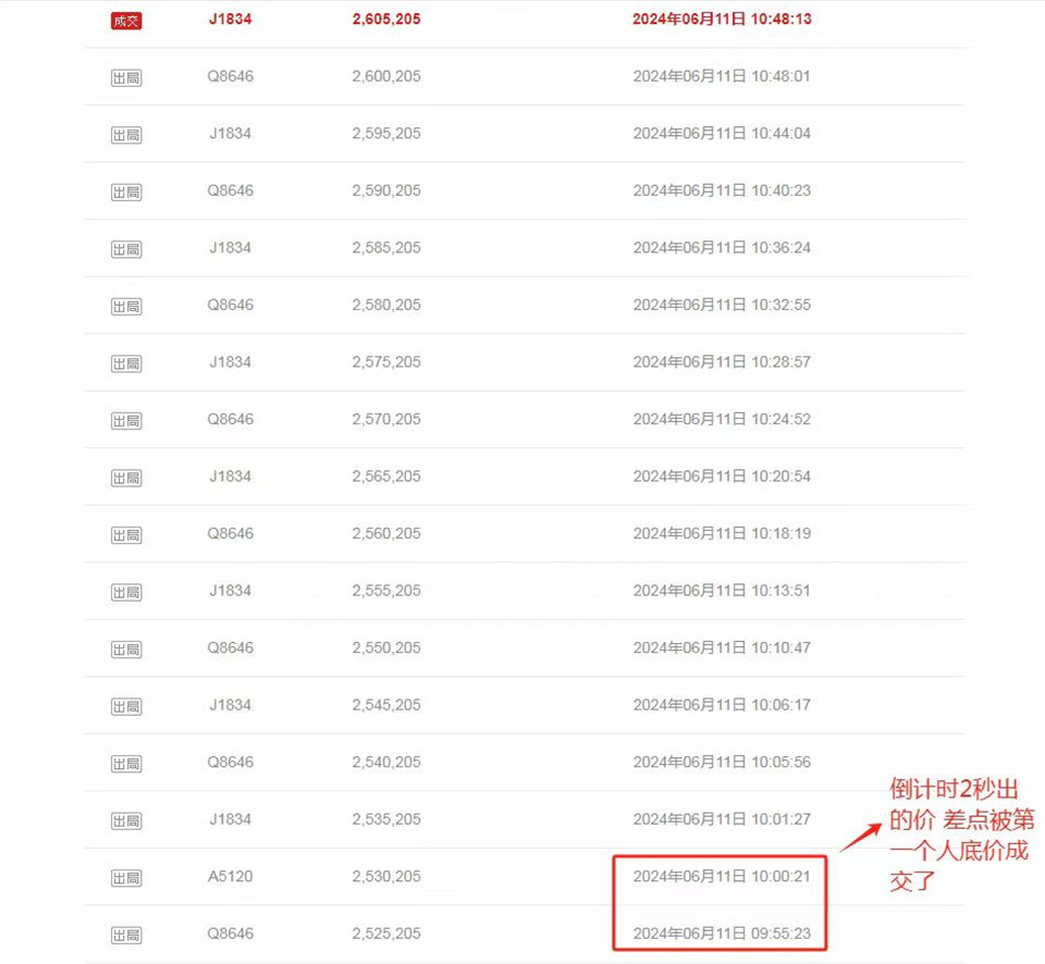 趕緊準(zhǔn)備保證金報(bào)名(因?yàn)殄X在理財(cái),還讓我BB轉(zhuǎn)給我的保證金),轉(zhuǎn)進(jìn)來已經(jīng)10點(diǎn)了,我報(bào)名的時(shí)候已經(jīng)10點(diǎn)01分了,差點(diǎn)我就沒拍的機(jī)會(huì)了,第一個(gè)出價(jià)的Q8646差點(diǎn)底價(jià)成交了,在倒計(jì)時(shí)4秒的時(shí)候,另外一個(gè)A5120(恩人)出了一手價(jià)給續(xù)命了一下若A5120不出價(jià),Q8646直接底價(jià)成交,給了我?guī)追昼姇r(shí)間讓我能報(bào)上名出價(jià)(如沒我去搗亂拍,就是Q8646撿漏),最后讓我給260.5萬拍下來了,只能說真的太幸運(yùn)了。